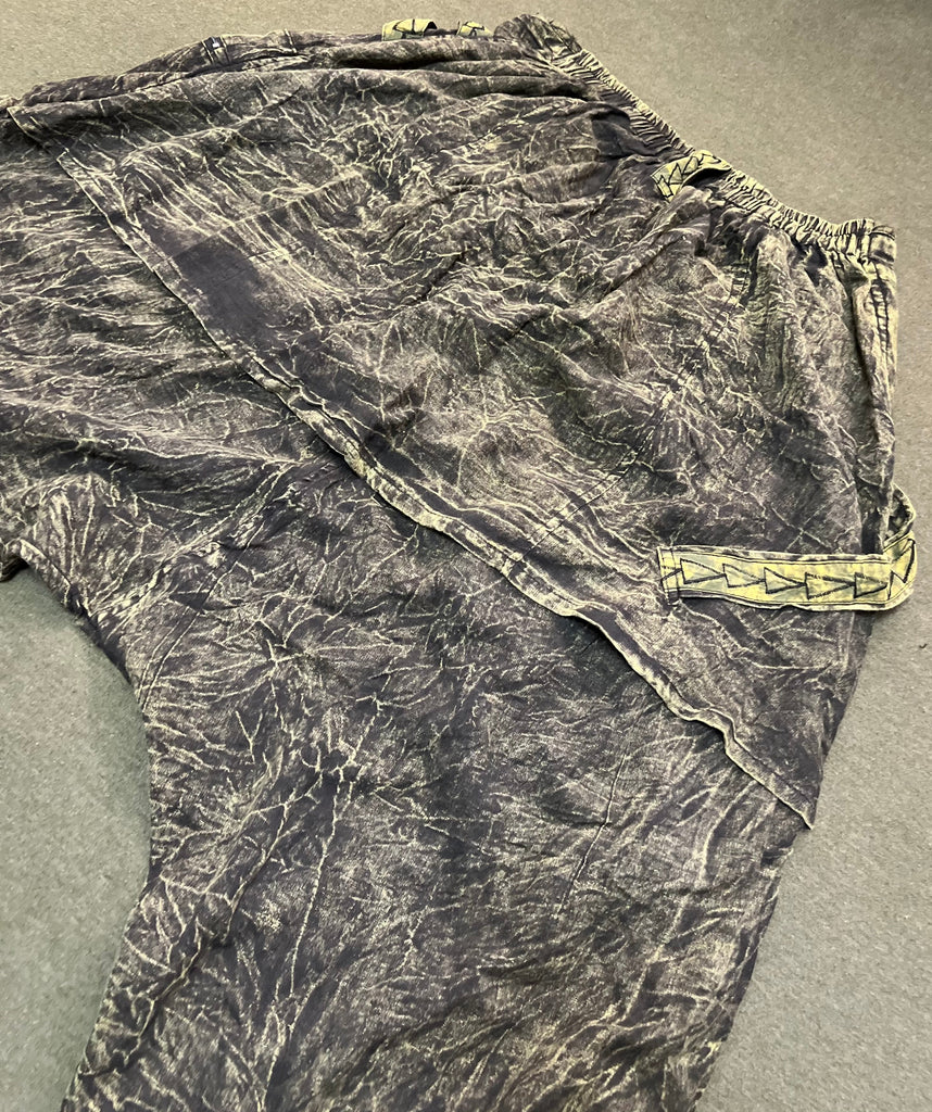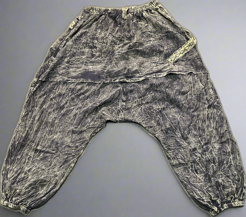 These olive-green drape back drop-crotch pants are designed for comfort and individuality. The cotton fabric has a washed finish that creates a textured, lived-in look. The relaxed drop-crotch cut allows free movement, while elastic cuffs bring a gentle taper at the ankles. A drape panel in the back sets these pants apart, giving them a flowing, distinctive silhouette. Double side pockets provide both storage and style. One pocket has a zipper, and the other closes with a button flap. Each pair is handmade in Nepal using traditional methods, so the stitching and wash will vary slightly, making every piece one of a kind. Lightweight yet durable, these trousers are perfect for casual wear, lounging, or travel, offering function with standout design.