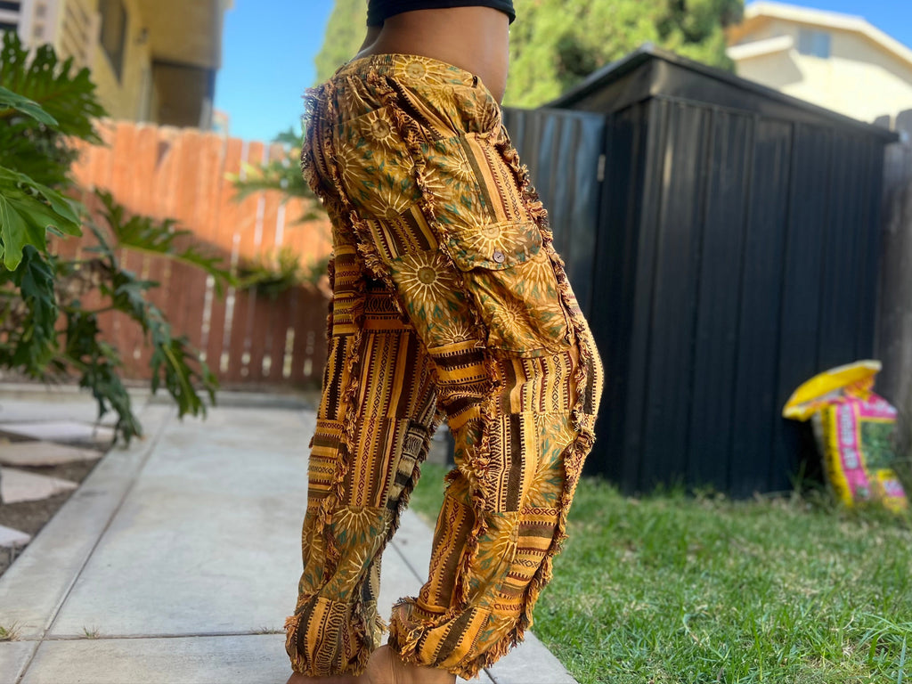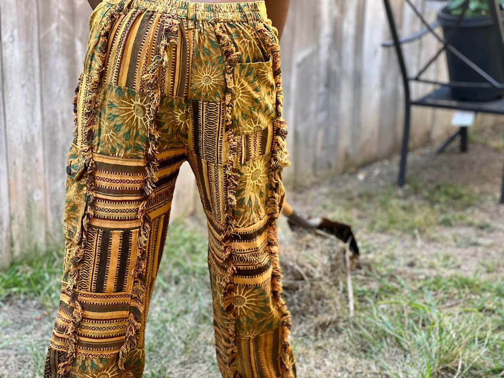 These handmade sunflower patchwork pants are inspired by the warm golden tones of sunflowers. Each pair is carefully assembled from cotton patchwork panels, blending shades of yellow, gold, and earthy hues for a vibrant yet natural look. Designed with a relaxed straight-leg fit and adjustable drawstring waist, they offer comfort for daily wear, lounging, or travel. The lightweight cotton fabric makes them breathable and easy to move in, while the patchwork design ensures every pair is one of a kind. Traditionally handcrafted in Nepal, these pants carry slight variations in color and stitching that highlight their authentic handmade character.